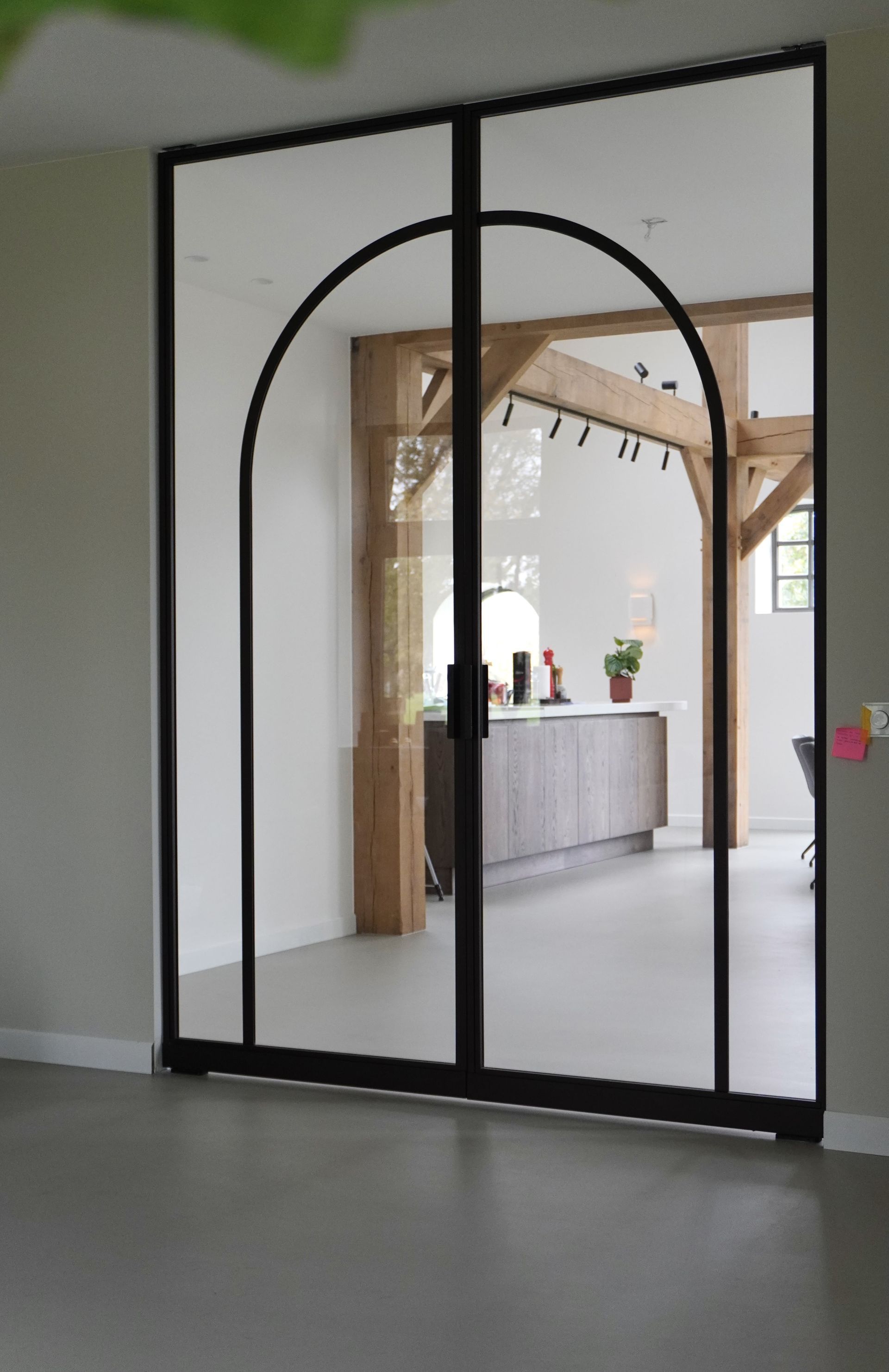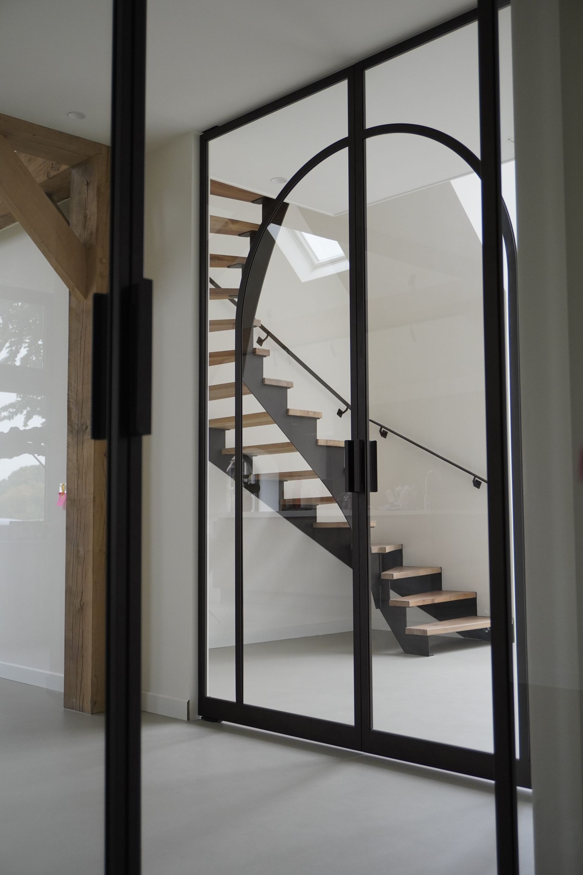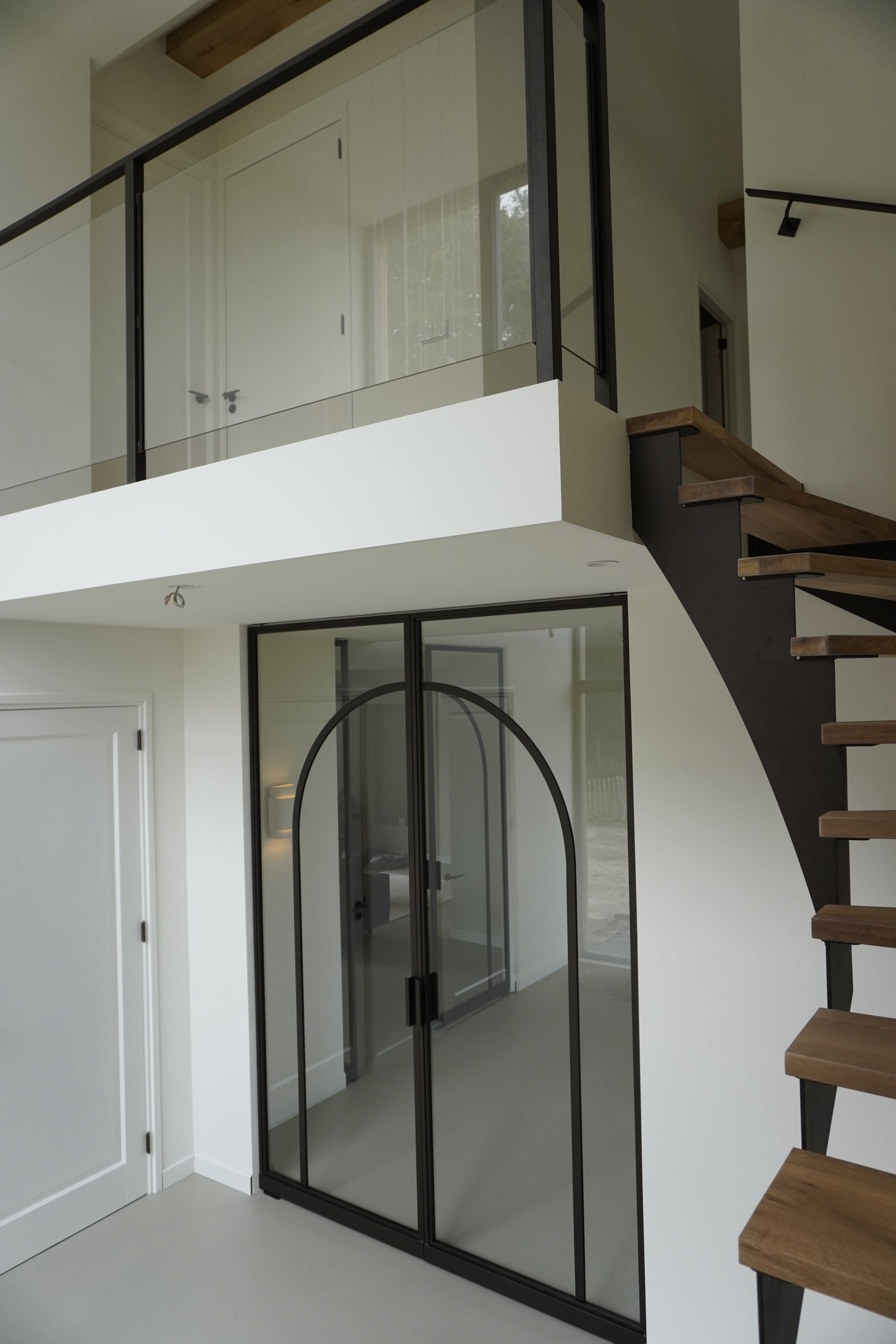 De trap wordt prachtig aangevuld met stalen taatsdeuren in dezelfde bronskleur, waarin elegante togen zijn verwerkt. Deze ronde vormen brengen zachtheid en karakter in het strakke lijnenspel van het staal, waardoor een harmonieus geheel ontstaat tussen modern design en klassieke elegantie.