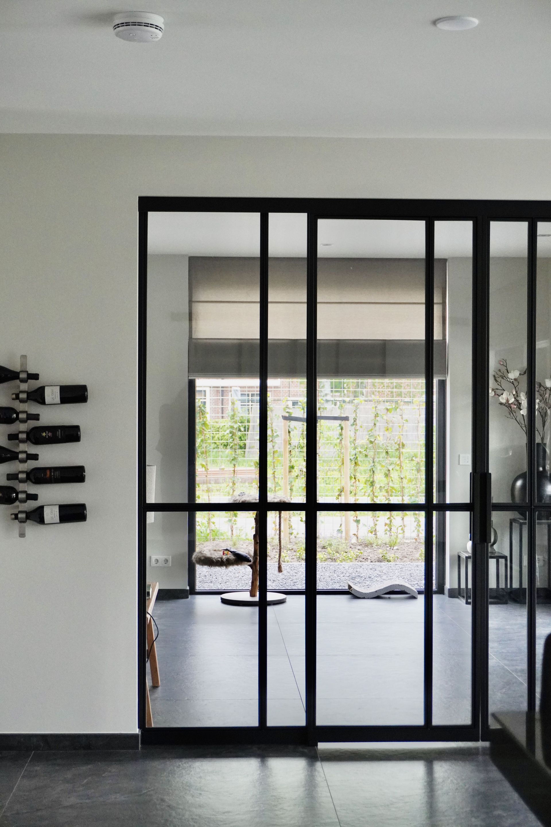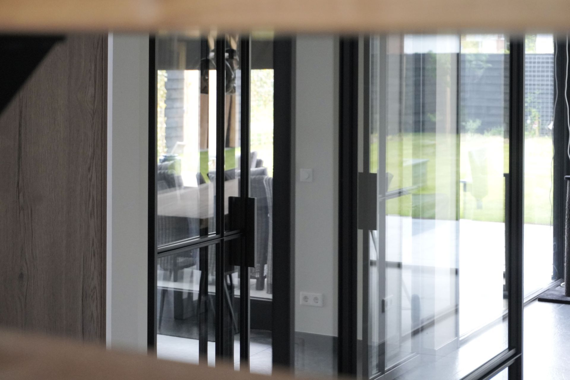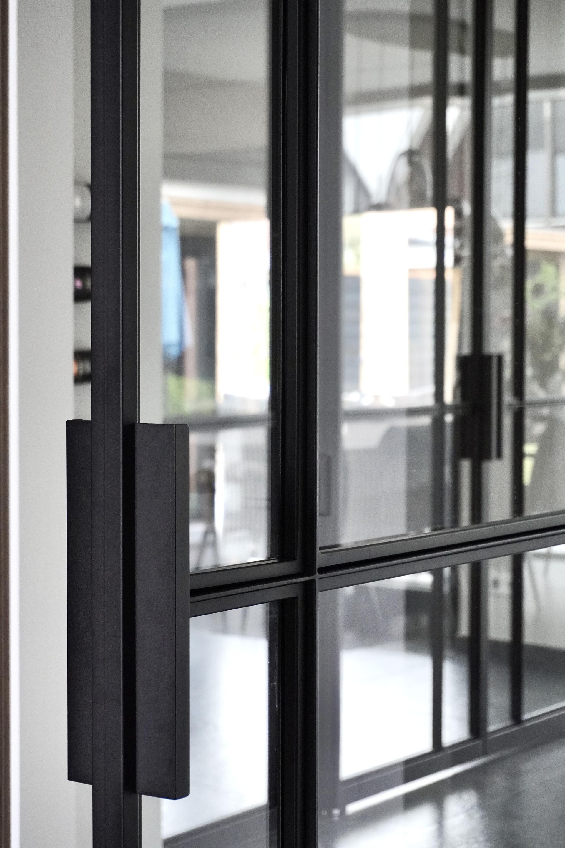 Tegenover de trap staat een serie op maat gemaakte taatsdeuren, uitgevoerd in hetzelfde rijke staalzwart. De klant koos een indeling van hoge, smalle ruiten afgewisseld met bredere vlakken, gevuld met helder glas – perfect voor de balans tussen openheid en privacy. Dankzij het taatsmechaniek zwaaien de deuren soepel zonder zichtbare scharnieren en sluiten ze altijd geruisloos in het midden terug.