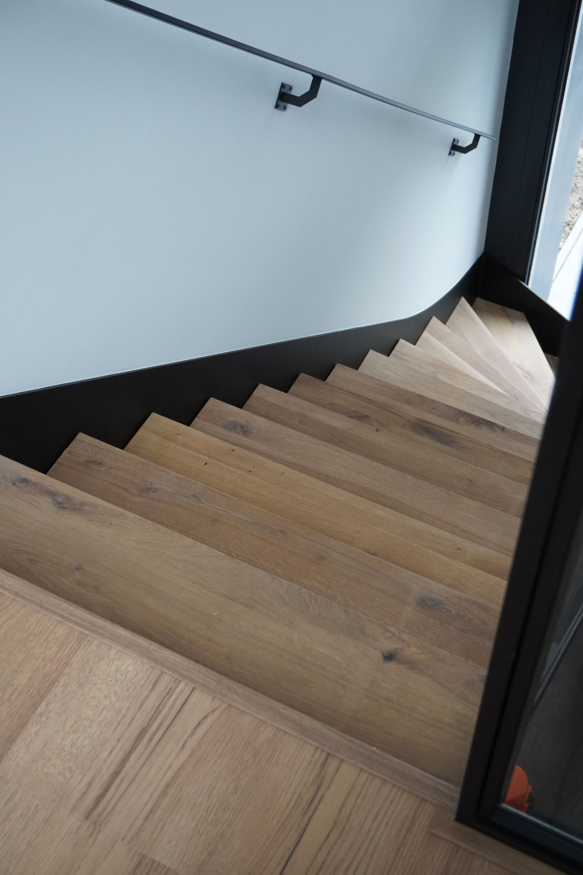 In de ruime hal ontvouwt de trap zich als een sculptuur van staal en hout. Het stalen skelet is naadloos gelast en mat zwart gespoten, waardoor het slanke profiel bijna gewichtloos oogt. Daartegenover contrasteert het massief eiken, waarvan elke tree is geschuurd en licht geolied voor een subtiele glans en antislip-veiligheid. De open leuning met dunne, verticaal geplaatste spijlen zorgt voor maximale lichtinval en een vrije blik door het interieur.