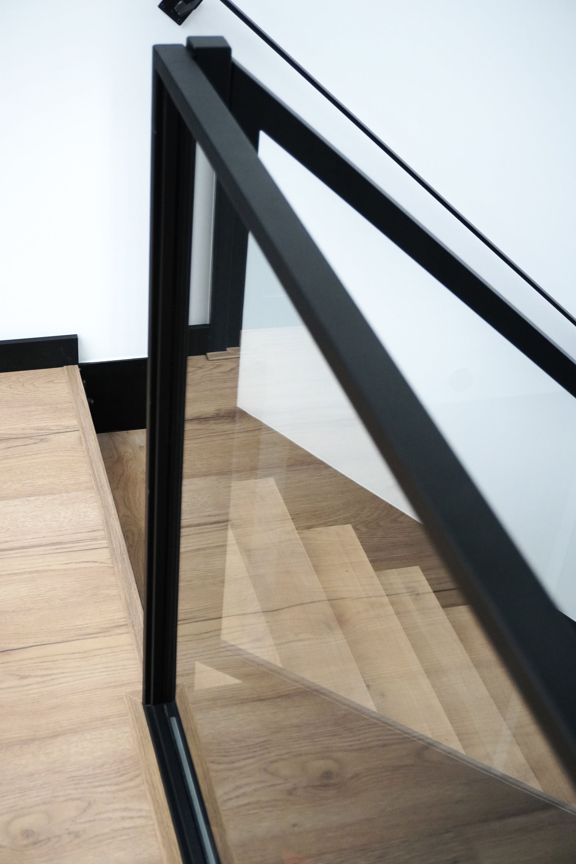 Het samenspel van matzwart staal, glas en natuurlijk eiken creëert een tijdloze, luxe sfeer. Daglicht valt vrij door het volume van de trap en de transparantie van de deuren, terwijl de donkere frames diepte toevoegen en een verfijnde architecturale lijn trekken. Elk detail – van de hoekverdraaiing van de traptreden tot de finesses van de lasnaden in de deurkaders – getuigt van onze passie voor vakmanschap en design.