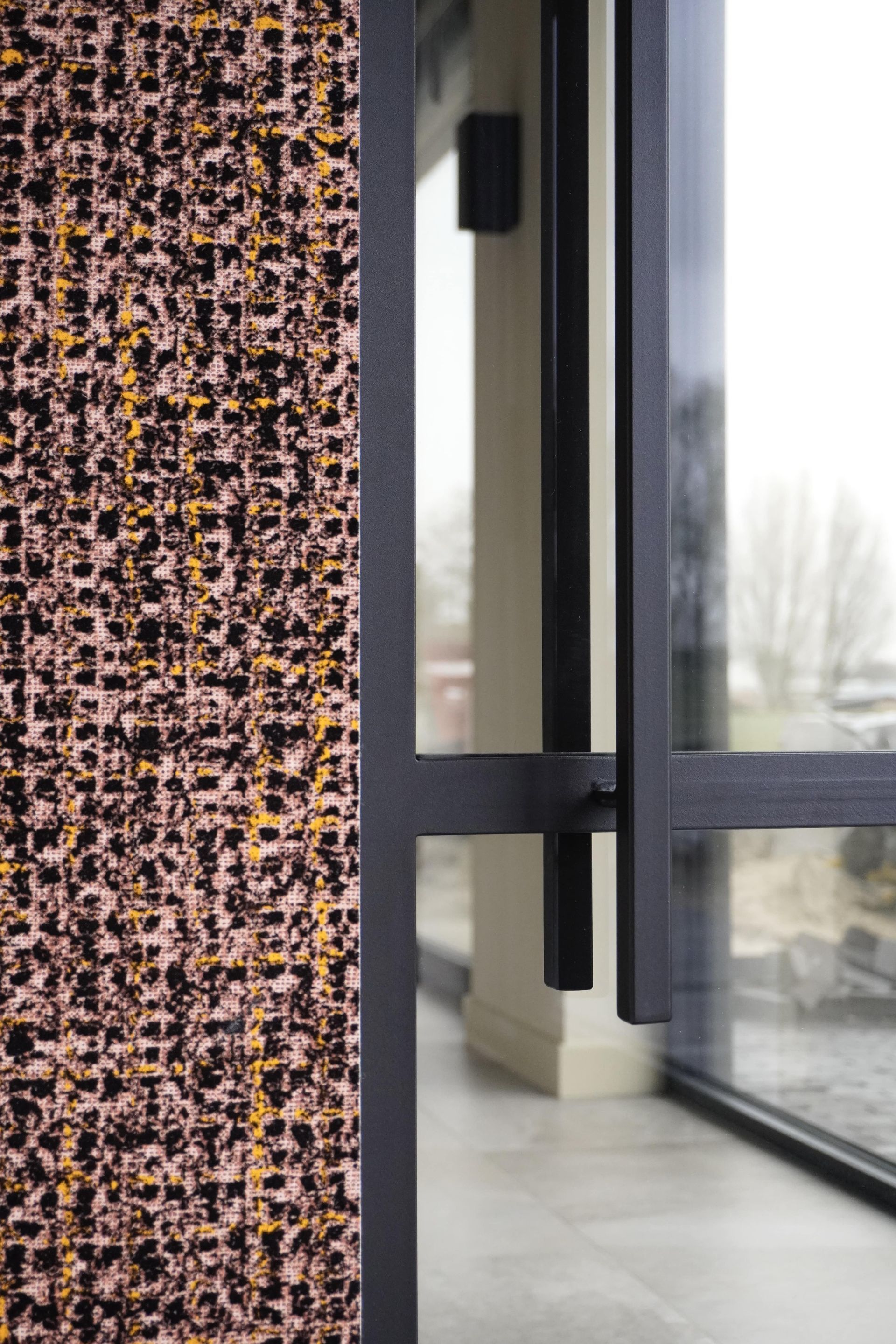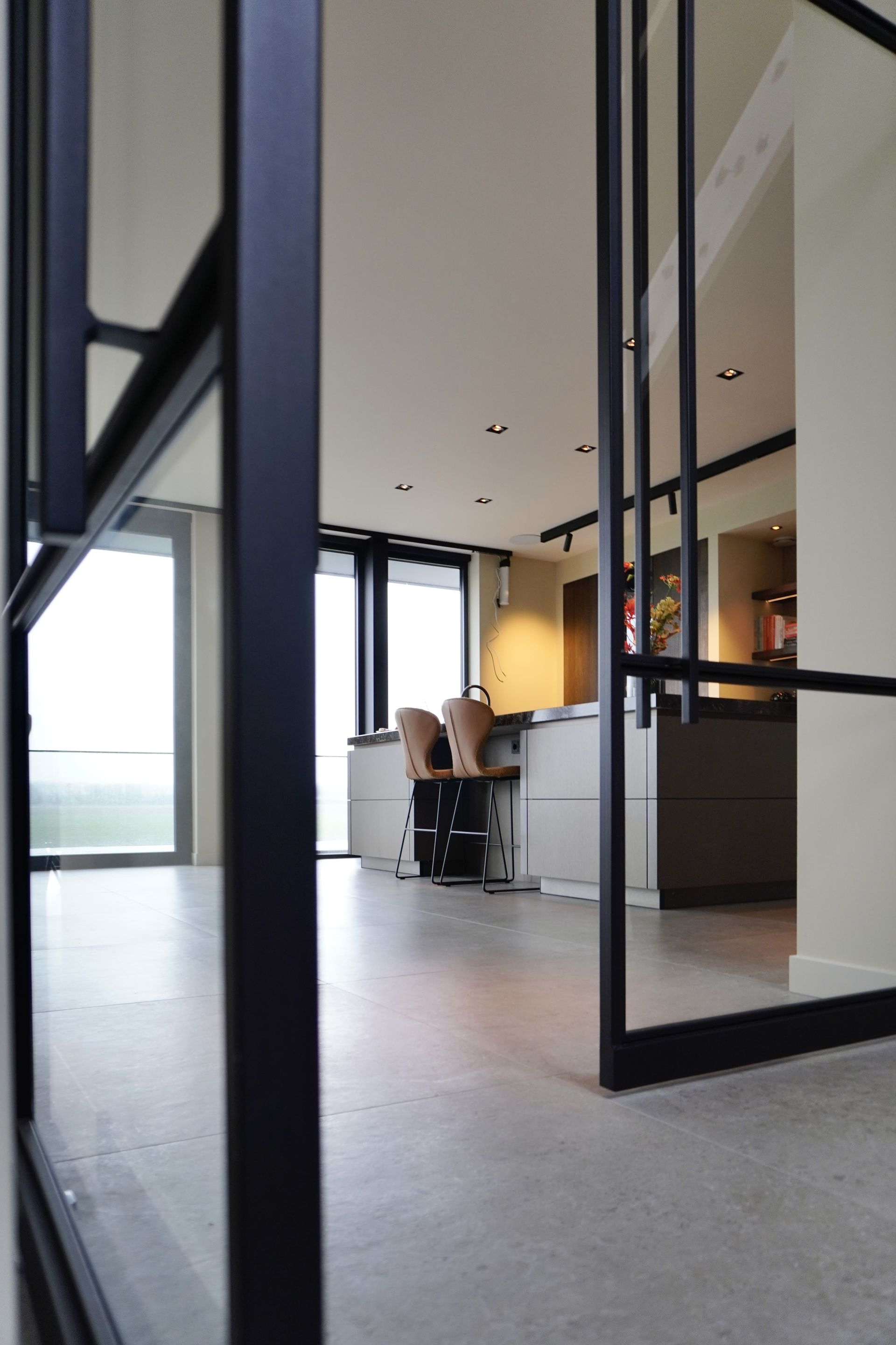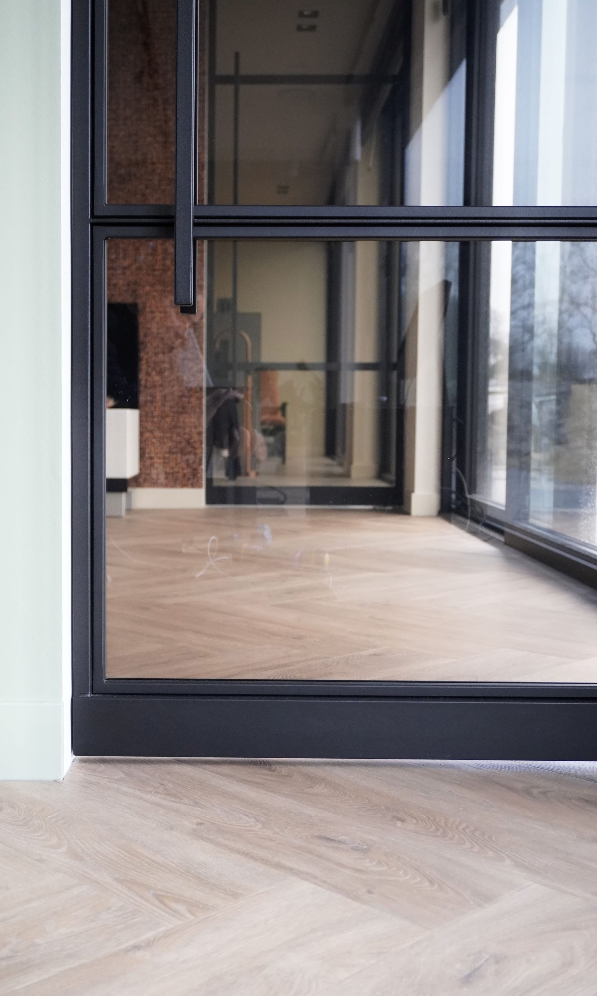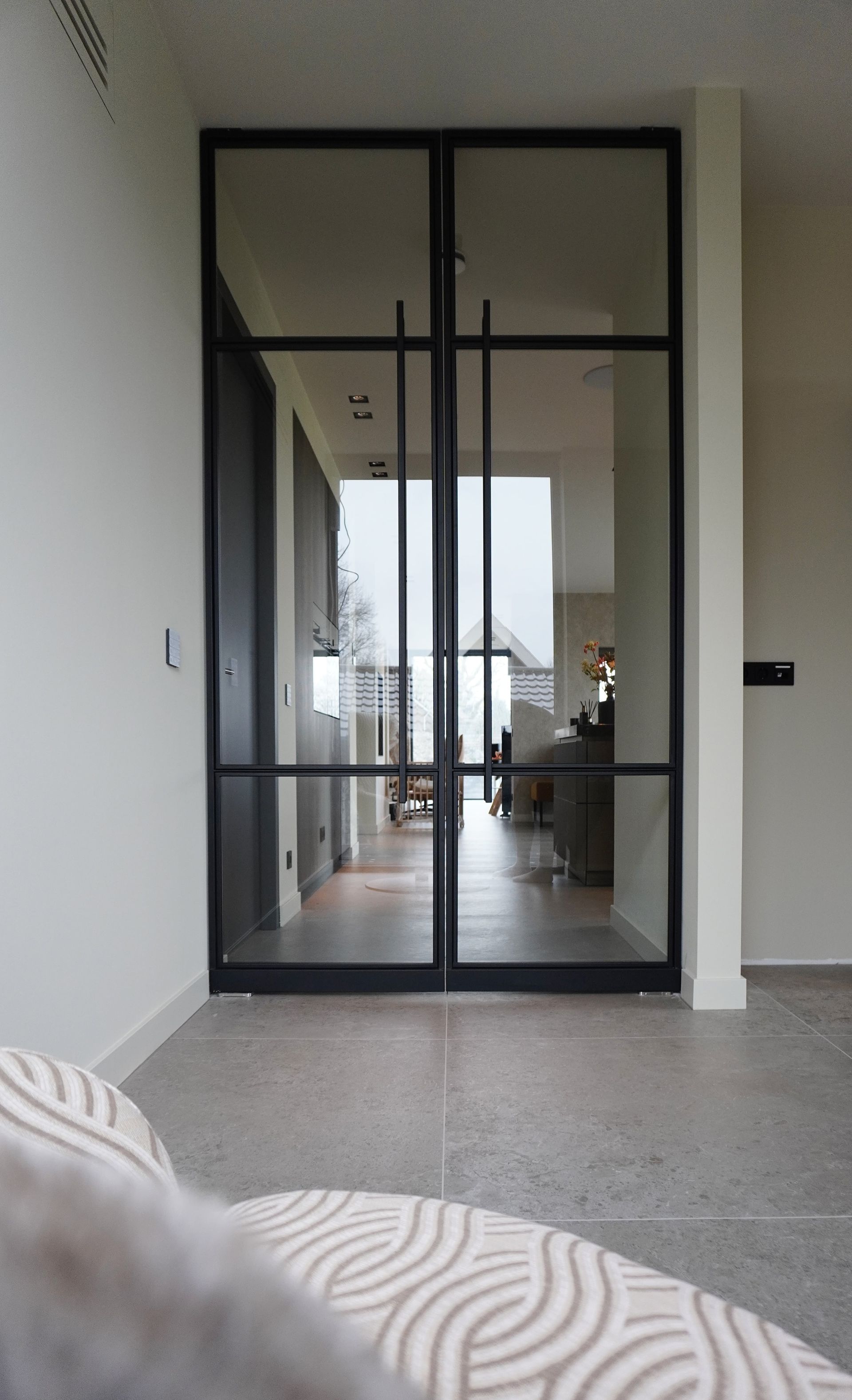 Hollemans Homesteel introduceert met deze zwarte taatsdeuren een perfecte mix van transparantie en design. Het slanke, mat zwarte stalen kader omlijst verblindend helder veiligheidsglas, waardoor de deuren als grafische lijnen in de ruimte staan en daglicht ongehinderd tussen woonkamer en hal stroomt.