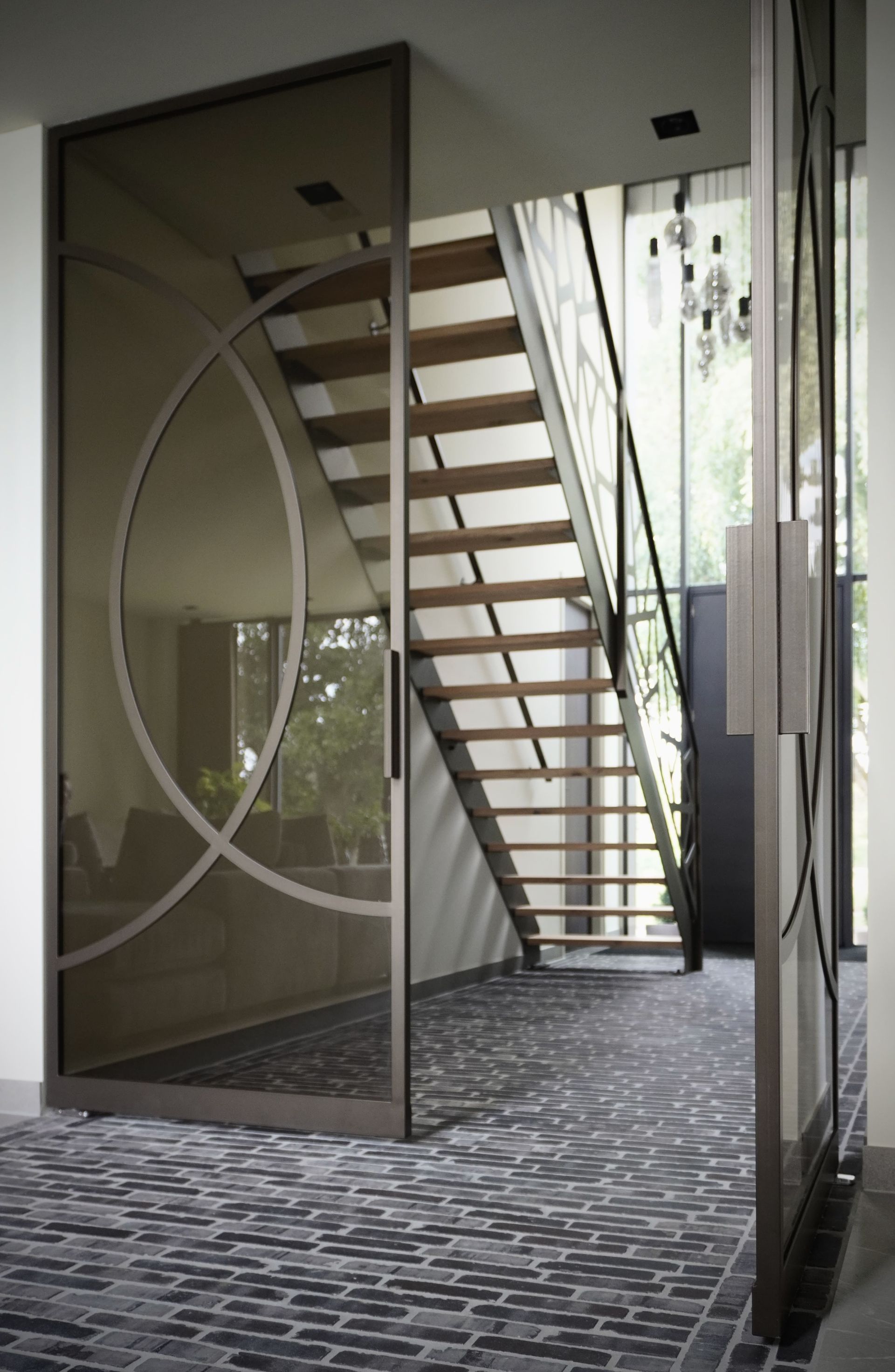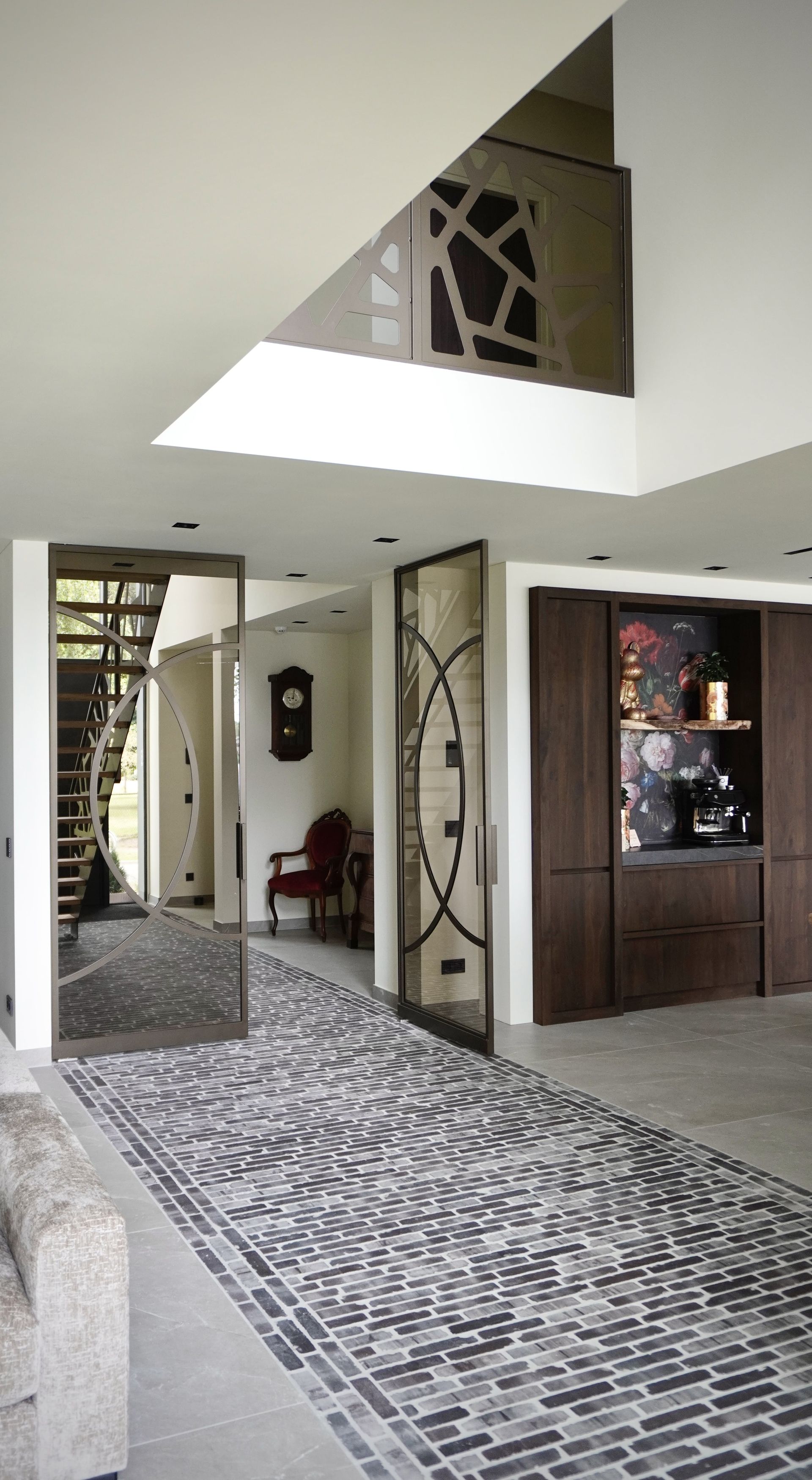 De brons-stalen taatsdeuren maken het plaatje volledig af. De klant koos zelf de indeling van de taatsdeuren en het type glas en wij vertaalden deze wensen naar perfect afgewerkte deuren met een warme brons-coating. Deze coating geeft een warme tint, is kras- en vingerafdrukbestendig en behoudt haar schoonheid jarenlang. Dankzij het taatsmechaniek draaien de deuren soepel zonder zichtbare scharnierpunten, wat bijdraagt aan het strakke, moderne design.