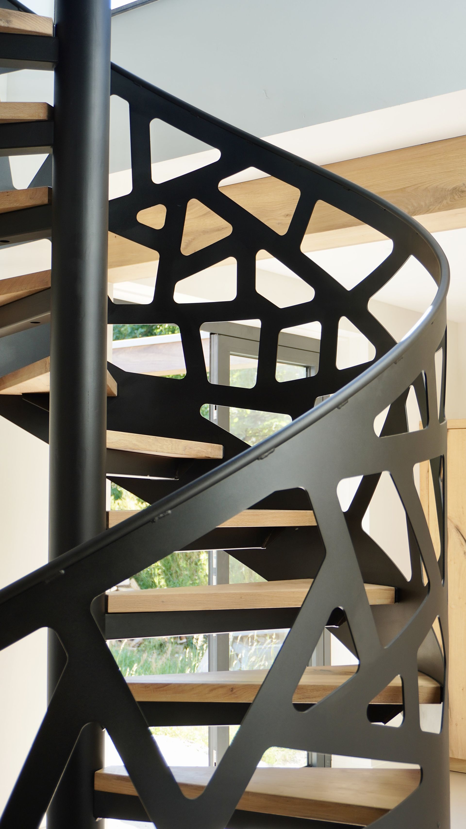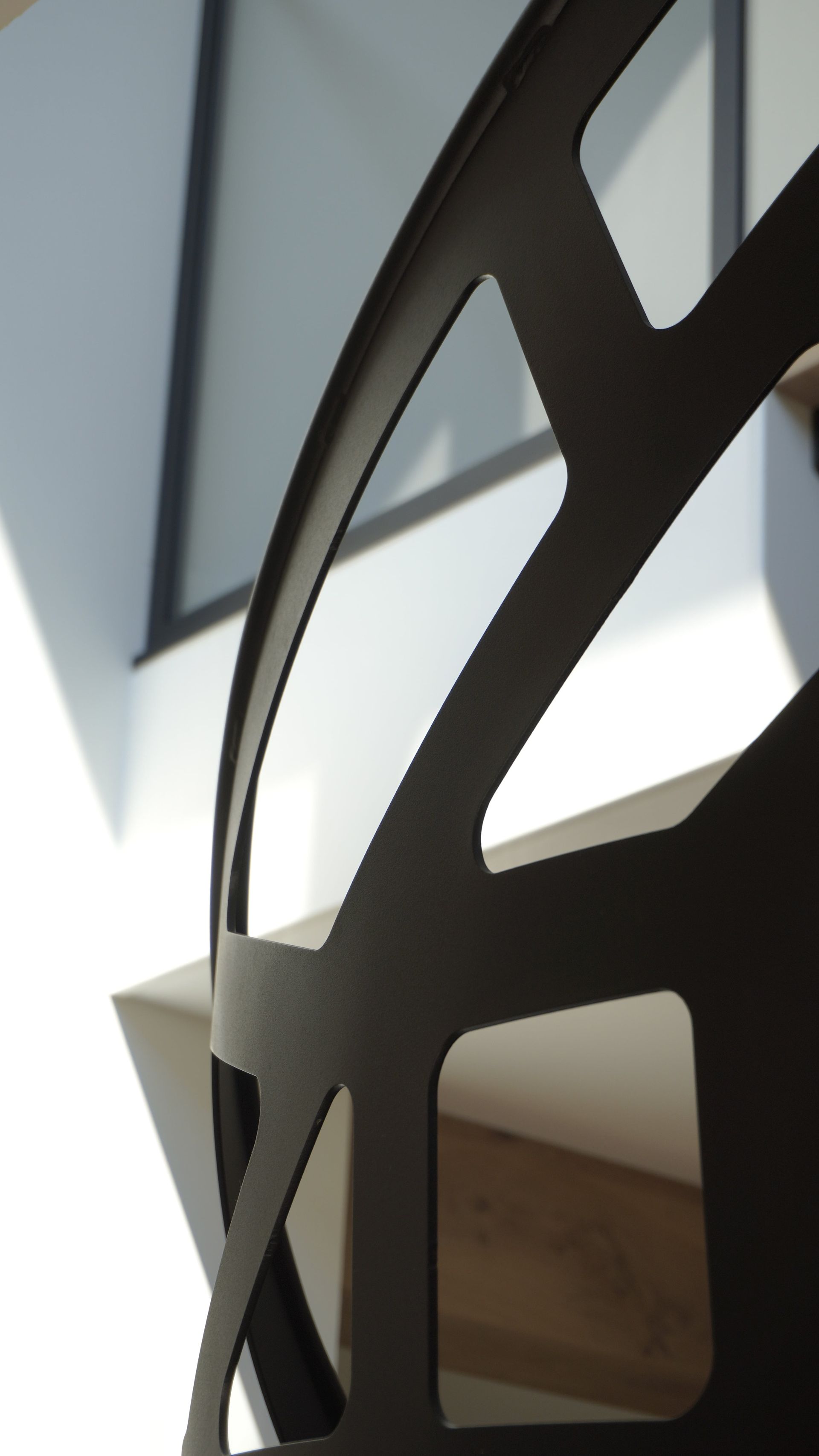De balustrade is vervaardigd uit lasergesneden staalplaten, met een eigentijds design van organische, diamantvormige uitsnijdingen. Dit patroon vangt het daglicht en werpt speelse schaduwen, waardoor de trap in iedere hoek van de ruimte telkens weer een ander gezicht toont. Bovendien zorgt de slimme perforatie voor open zichtlijnen, waardoor het totale interieur ruimtelijk en licht blijft.