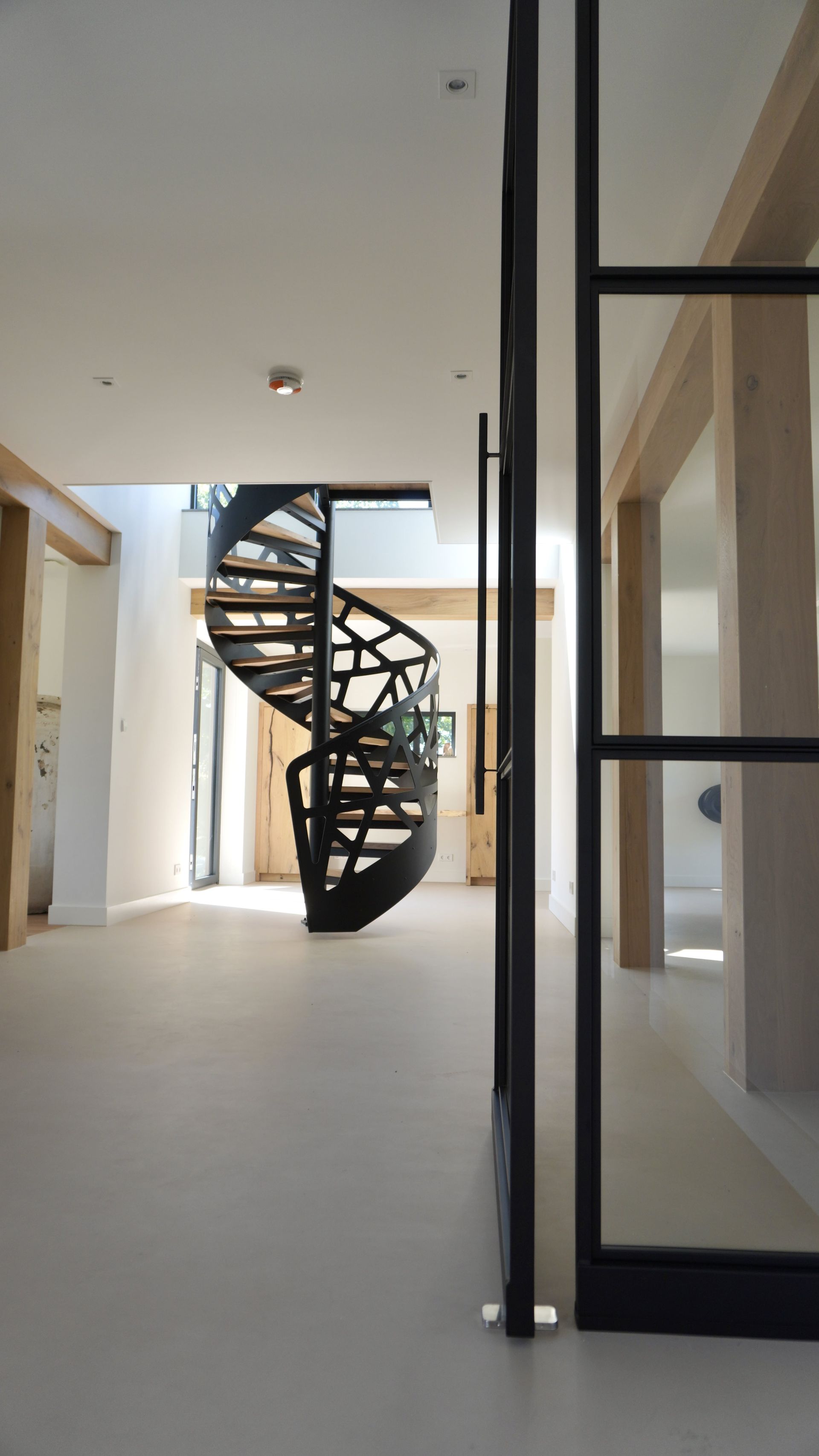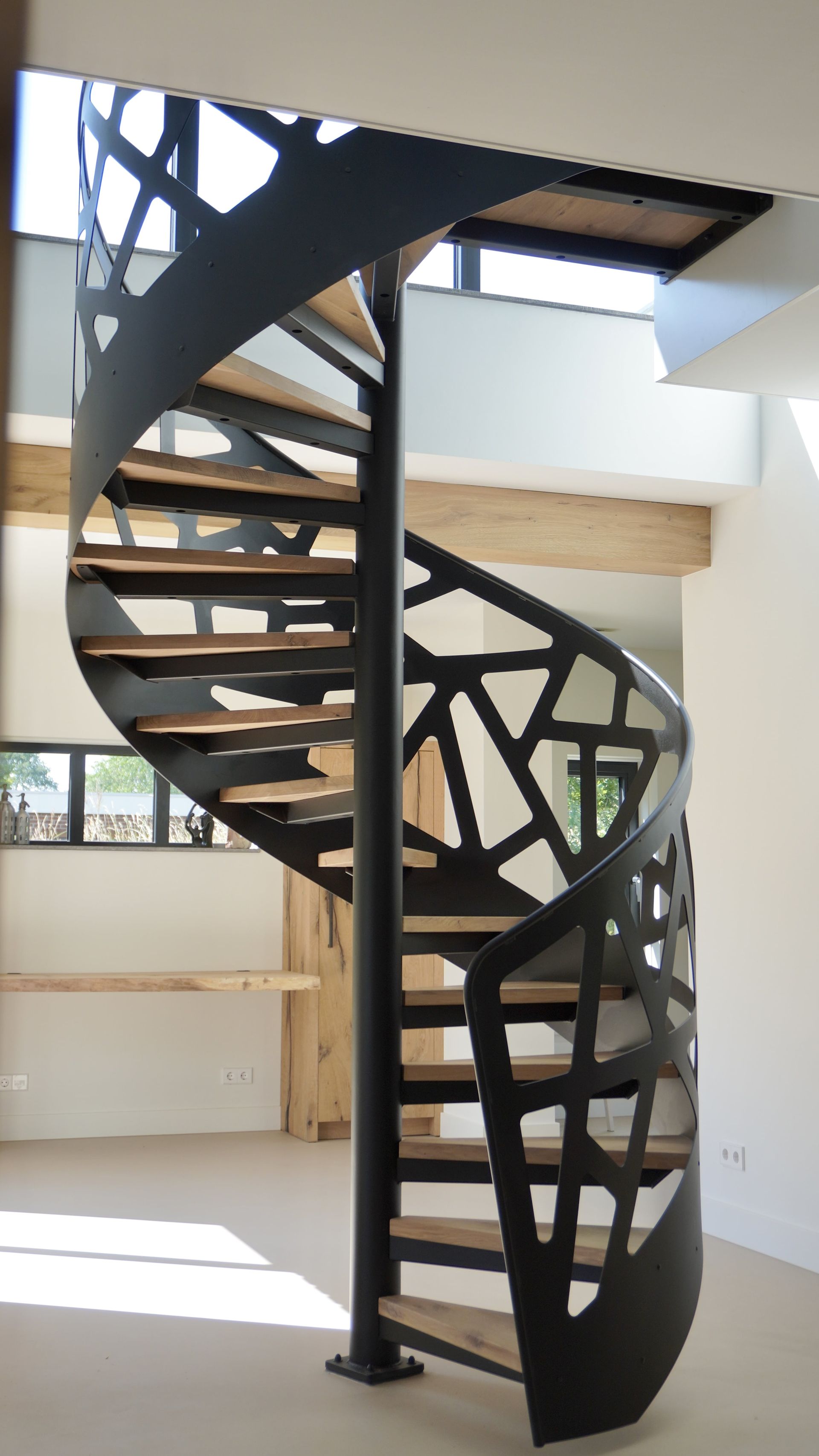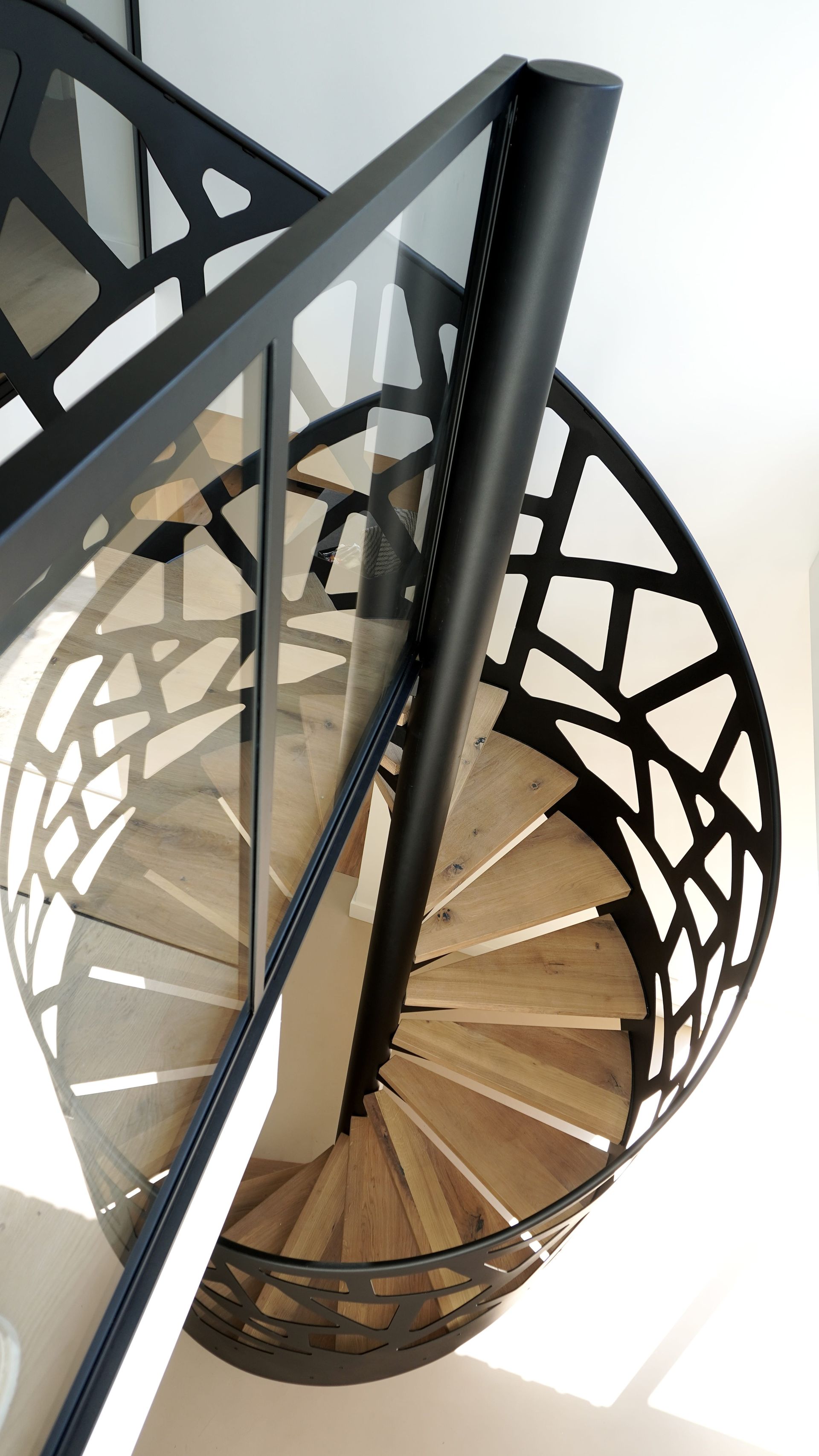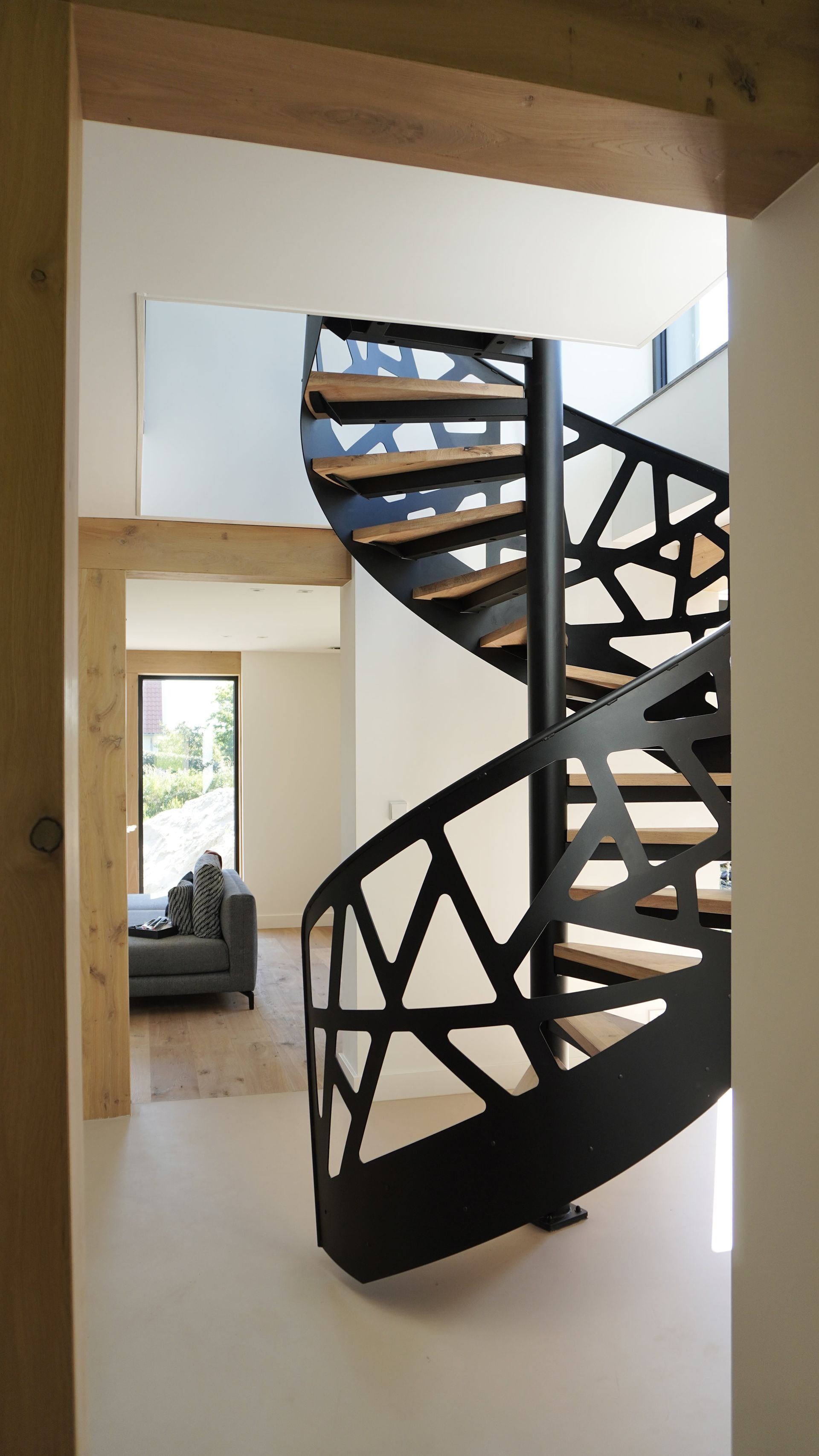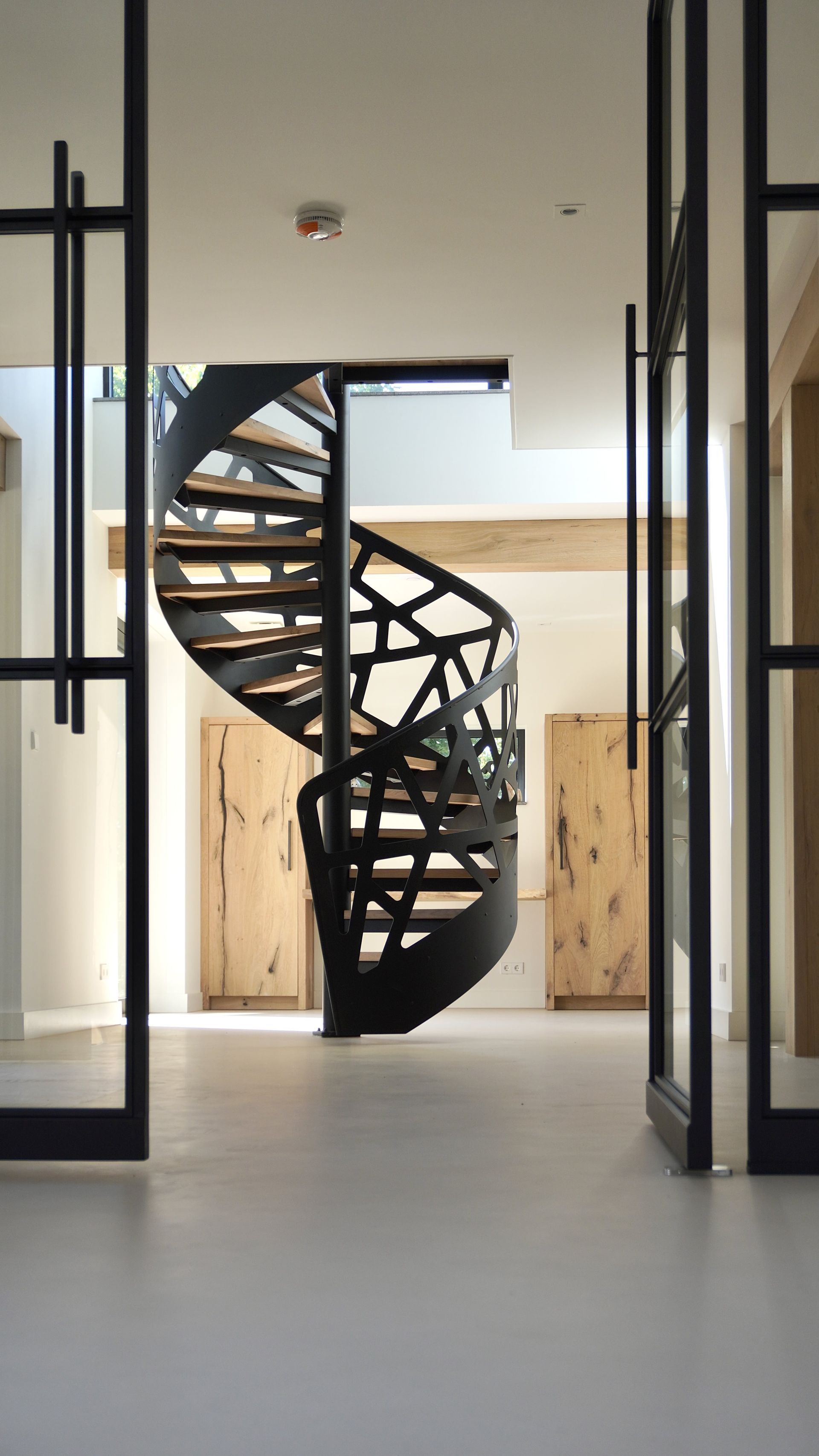 Van de eerste technische tekening tot en met de uiteindelijke montage in ons eigen atelier hebben we nauw samengewerkt met de opdrachtgever. Zo konden we de houtkleur perfect afstemmen op de rest van het interieur en het patroon van de stalen balustrade volledig afstemmen op de wens van de klant. Het resultaat is een sculpturale eyecatcher: een spiltrap die niet alleen verbindt, maar ook inspireert.