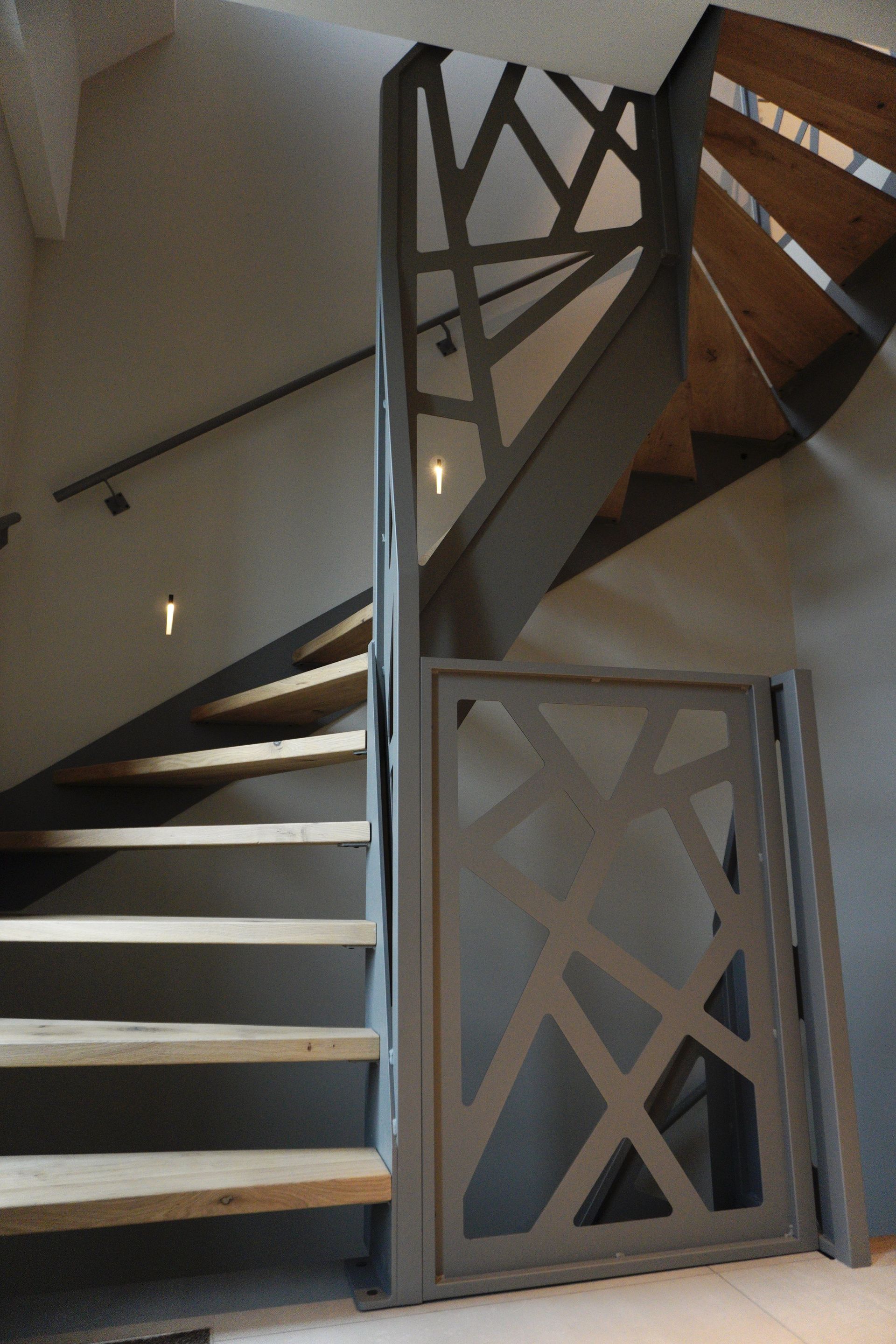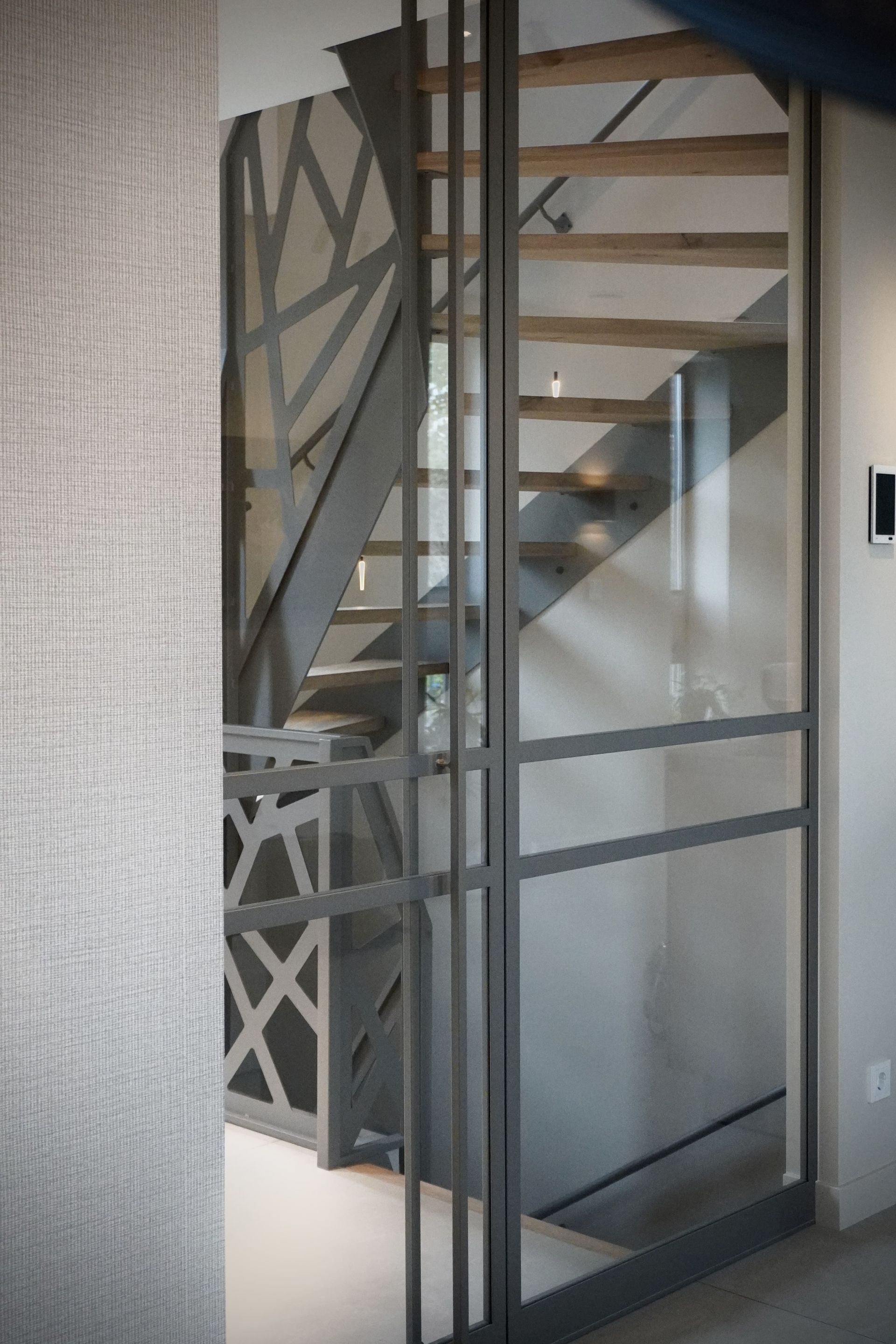 Moderne stalen trap in RAL 7039 met eiken treden en bijpassende stalen taatsdeuren